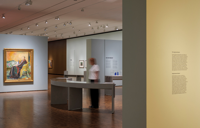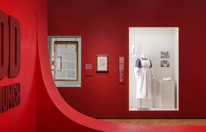 The section is painted in a green-brown shade and features multiple versions of Munch’s well-known motif, The Sick Child, including the stunning first version of the painting on exceptional loan from the National Museum, Oslo. The harrowing subject matter is accompanied by a seat with a high back support, offering literal back-up, with the seat directly adjoining a showcase. At one end of the bench, headphones are installed, which visitors can use to listen to an audio narrative about The Sick Child. At each end of the display case, text panels contain introductory information about tuberculosis and germ theory. The panels – as with all text in the exhibition – is in both Norwegian and English. Objects in this section include a ‘Blue Henry’ glass sputum bottle, which was used for tuberculosis sufferers to spit into.