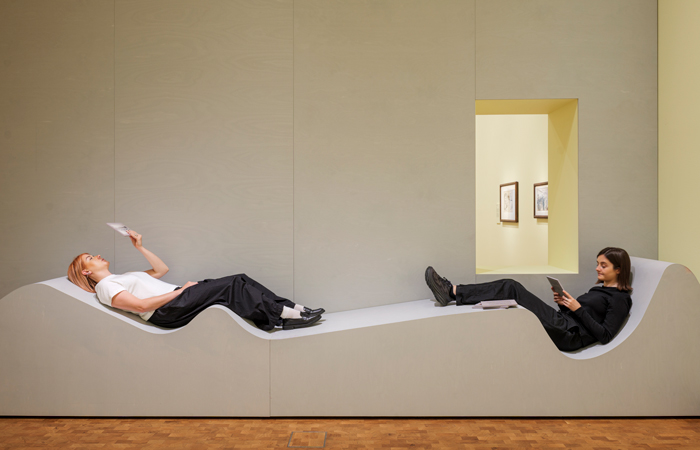 “We greatly enjoyed working with Curator Allison Morehead on this project. Allison’s vision was for a show that gave equal weight to the objects and to the paintings, and we developed a language of display with her that made the objects support the story. Along with the strong, corporeal colour palette for the walls and graphics, we developed furniture designed to make visitors feel aware of their bodies, and the way that they are sitting, so that they question the objects and content in a different way. We worked with contractors to prototype furniture that is really bespoke and able to support unusual perspectives and different ways of viewing the objects.”