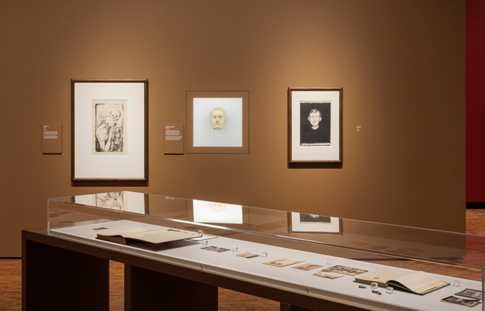 The penultimate area of the exhibition examines Munch’s relationship with doctors, as both friends and patrons, as well as examining the artist’s grief over the death of his doctor-father in 1889. Painted in a dense mid-brown, the space features exhibition walls set in a wide V-shape, containing one see-through aperture, with a bench and arm-rest to one end. Exhibits include a hearing aid which belonged to Munch’s sister, Inger, and Munch’s death mask, moulded in plaster of Paris from his face, made shortly after his death in 1944. The mask is mounted invisibly, as if floating in darkness.
