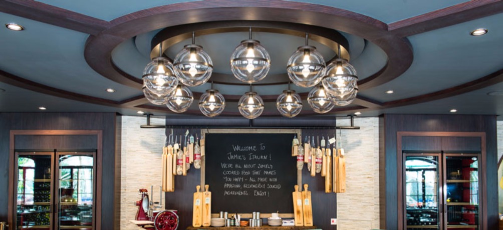 Central Park where magnificent street lamps housed sound systems inside them, where Jamie’s restaurant featured chandeliers dressed with mouth blown glass balls and Vintages where ceiling fittings and wall lights were gold gilded and dressed with crystal; the Windjammer restaurant where Chelsom created food whisks with tiny LED lights concealed within to illuminate the servery;