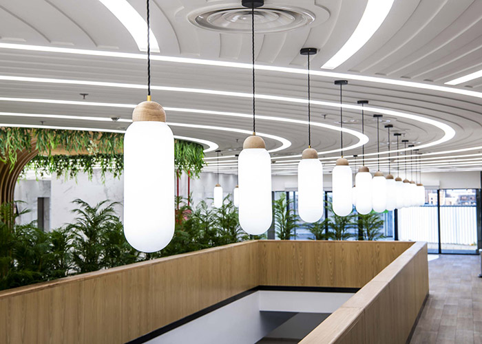 In amongst the space were three square supporting pillars. They didn’t really sit well within the overall space so we opted to make a feature of them. The square pillars were made cylindrical and clad with Oak timber slats to create tree like structures. These structures reach up into the ceiling forming tree like canopies. We used these canopies as the primary source of light for the space. Due to the large spaces there is a lack of natural light, so we created lighting installations designing to mimic sun light. By using programmable LED matrices the right kelvin levels are calibrated to create the illusion of sky. The dappled light and blue tones then pass through the tree canopies.