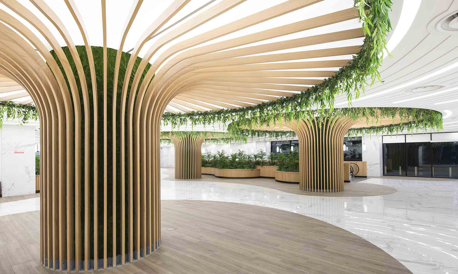 The surreal experience of strolling through a park is then completed with the addition of curved pathways mixed with plenty of greenery. All together our shopping mall public space design creates a welcoming interior, offering an enjoyable experience of surroundings for people to meet, have a bite to eat and enjoy some retail therapy.
