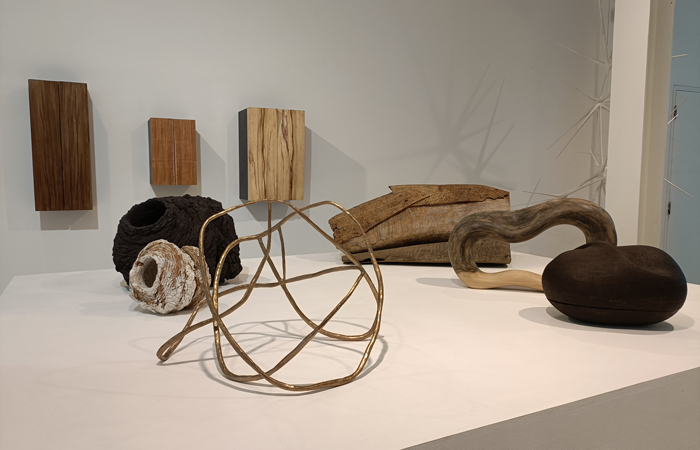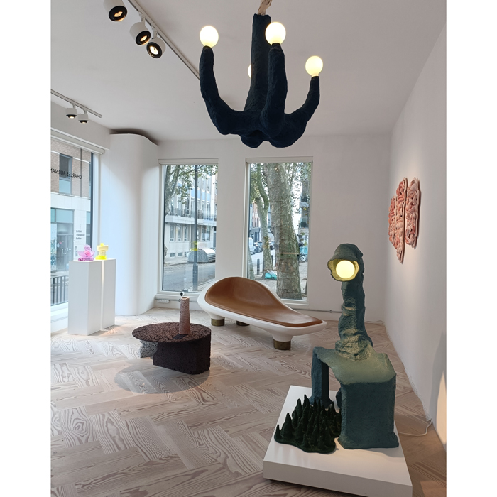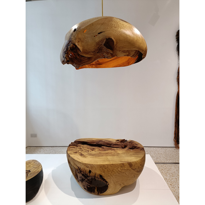 Sarah Myerscough Gallery celebrated its silver jubilee with the Collections exhibition, which brought together sumptuously crafted works by an array of artists and designers represented by the gallery during its 25-year period. Once again, form and texture tended to follow material properties, with a number of the works displaying almost primordial qualities. Raw stoneware and ceramic featured from the likes of Aneta Regel and Luke Fuller but wood, the gallery’s first love, shone through the brightest and offered a unique variety of textures. Sculptor Nic Webb combines traditional craft skills with less conventional and experimental techniques, which was demonstrated with the Oku light and table. While awe-inspiring due to the sheer scale of the pieces alone, both objects possess a beguiling mix of raw and smooth textures across the curbed forms, which are created through the attritional process of sand blasting.