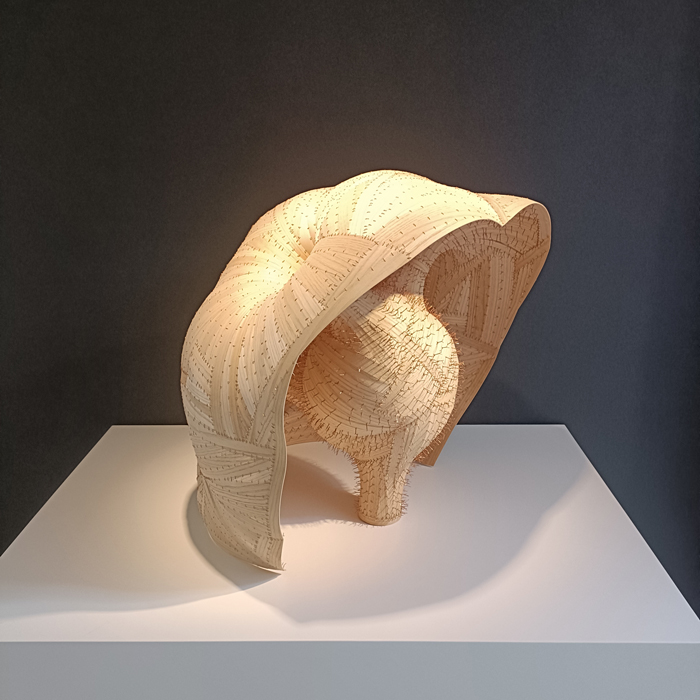 Further blurring of the boundaries between design, art and craft were on display throughout the showing, not least via Heechan Kim’s wooden structure, which had its own alien qualities while simultaneously feeling familiar in form. The curved untitled object is impressively crafted from slim sections of wood veneer that are joined by small twists of wire. As such, the overall shape has an inside and outside, both of which vary in their texture, and evoke fruit, shells and perhaps even the valve of a heart.