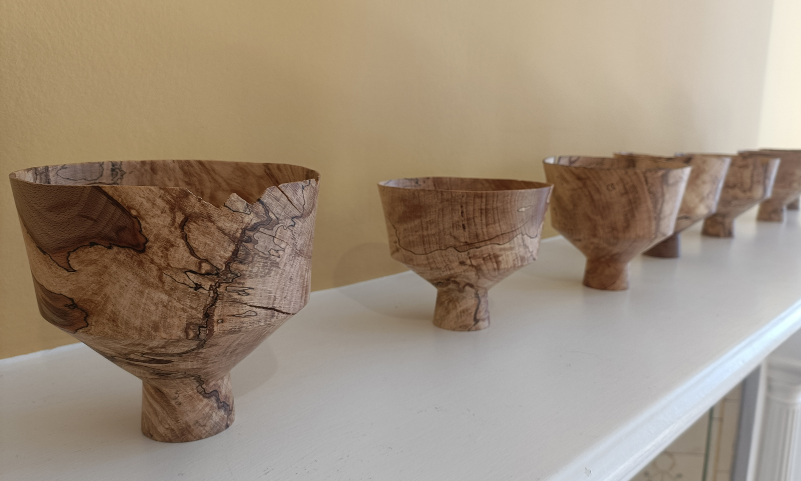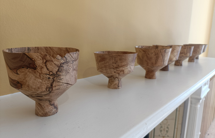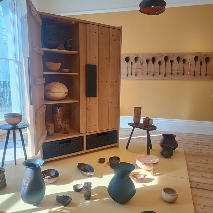 Lathe-turned vessels and hand-carved spoons adorned the space along with green wood-worked and woven willow pendant lights. Bainbridges’s turned vessels and open forms in particular showed how the materials can be processed to create smooth and rather delicate textures, working with the natural grain to emphasize shape and create uncommonly thin wooden structures.