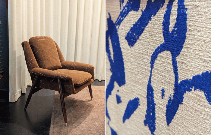 - Ichi-Go Ichi-E – Not only does this design have a wonderful name, but its textured weave is enhanced by a vibrant Yves Klein blue flocked surface pattern. Fascinatingly, the designers chose to reinterpret the same design through a metallic jacquard weave in their new Akhlat fabric, creating two distinct material expressions of the same concept.