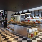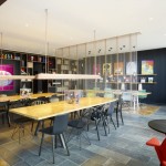 Arriving on the first floor guests have a clear view of the entire space, including the typical citizenM cabinet that runs along the lobby and guides them to the check-in, a lounge bookcase bench, collectionM, the bar and canteenM with large communal tables.