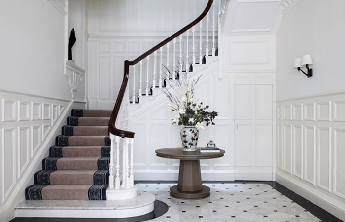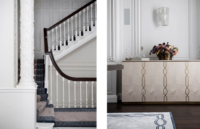 Schiller Beynon visited Loomah’s London showroom with photographs of the interior to discuss the creative theme for the project. Whilst they were devoted to restoring many of the property’s original features, the overall brief was to create a space fit for 21st century living, creating a perfect blend of old and new. They were drawn to the border detail of a traditional design from our archives. This was re-worked into runner design in a more modern colour palette that we were able to manipulate to run seamlessly around the contours of the staircase.