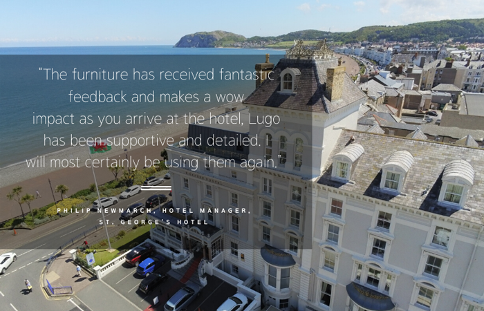 Lugo is a well-established British contract furniture manufacturer that produces stylish contract furniture for all areas within hotels, cruise ships, bars and restaurant environments. Lugo’s beautiful furniture has recently featured in St George’s Hotel. The 81 bedroom luxury seafront hotel on the North Wales Coast combines all the comforts of a 4-star hotel with Victorian elegance and stunning panoramic coastal views of Llandudno.