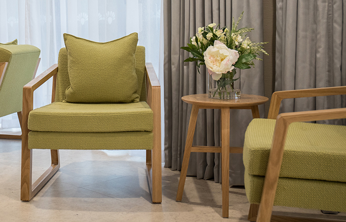 Lyndon’s timeless and elegant Luge armchairs bring a warm and inviting welcome to Quayside’s reception and main entrance. Setting the tone of exclusivity, they are upholstered in a green and grey fabric complemented by several coffee and side tables in a stylish Oak finish. In the communal lounge, a spacious and comfortable seating area features Lyndon’s Lysander sofas and armchairs upholstered in luxurious deep earthy tones, whilst relaxing Diana and Orten armchairs provide the necessary comfort and support for residents taking part in group tasks in the activity lounge.