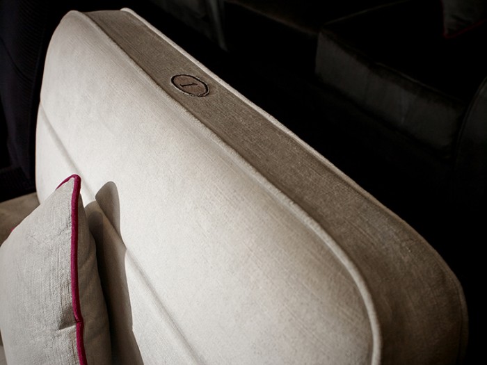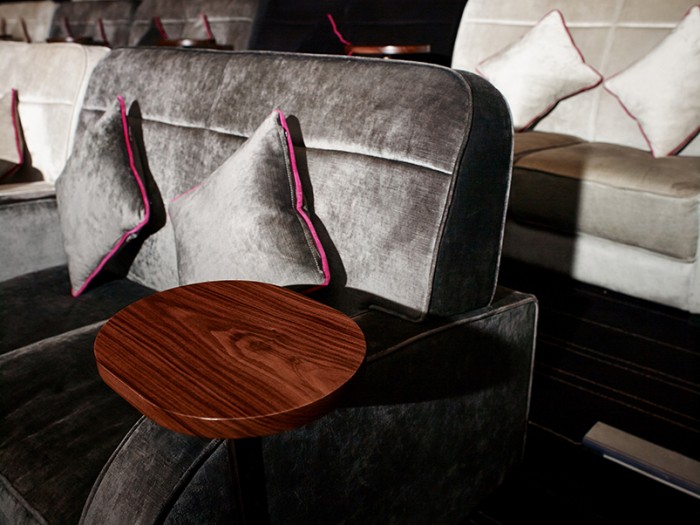 To complement its high quality upholstery and to further enhance the cinema experience, Lyndon Design also supplies handcrafted fitted walnut shelves to the back of each seat to act as personal tables above the carpeted footrests.