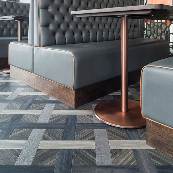 René was keen to replicate elements of a traditional British pub whilst bringing it up to date with 21st Century technology. To achieve the required look, he chose four types of timber finish from Amtico’s Signature collection in an intricate Basket Weave design.