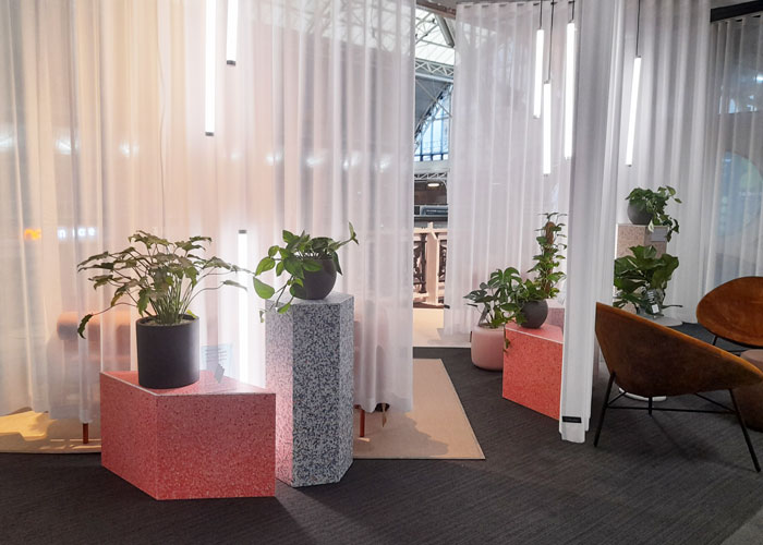Silent Gliss provided a fabric made from pre-consumer waste, to create partioning throughout the space.
