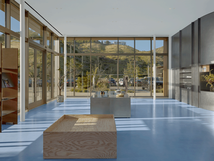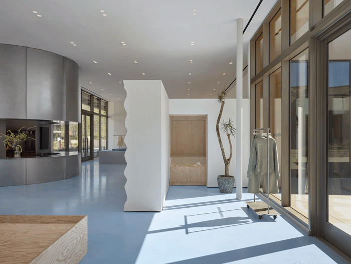 Reflecting the surrounding landscape of Cross Creek Ranch, elemental ruggedness is brought inside with a limestone surface framing the rails of apparel. Facing out of the full-length glass windows, the piece is in dialogue with the outside environment. Madhappy’s pastel hues are saturated here in the California sunlight, with a signature blue floor anchoring the design and mirroring the sky outside. An inventive plantscape by LA-based interior plant design studio, Plant Provisions, goes further in dissolving the indoor-outdoor divide. With a deep appreciation of nature, the space creates a feeling of liberation.