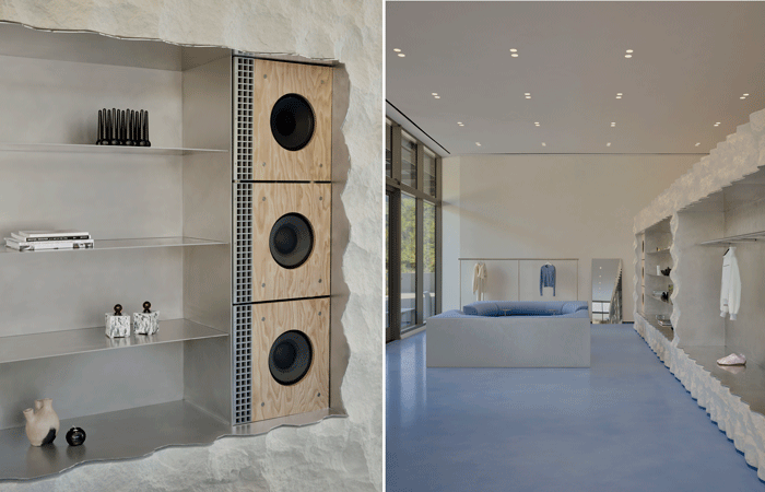 The lounge space presents a new take on Madhappy’s conversation area, with curved blue sofas within stainless steel creating an inward-facing social space. Bespoke speakers by House Under Magic in Douglas fir are set within the lazer-cut stone surface.