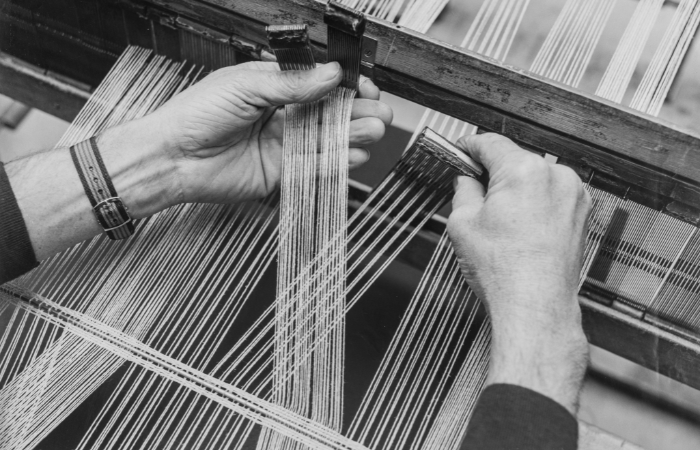 Peter Collingwood at Nayland, Suffolk (Crossing the rigid heddles when making a macrogauze) From the collections of the Crafts Study Centre, CWP_10_4_40