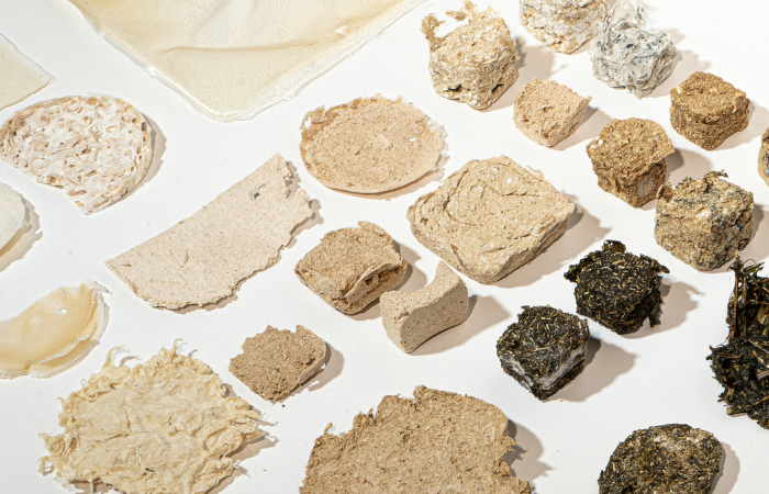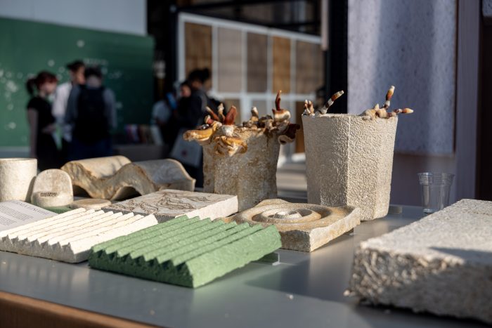 Across the exhibition, innovations ranged from bacteria-grown tiles and mycelium-based acoustic panels to structural components made from agricultural by-products. Here, we pick out some highlights from the extensive offering.