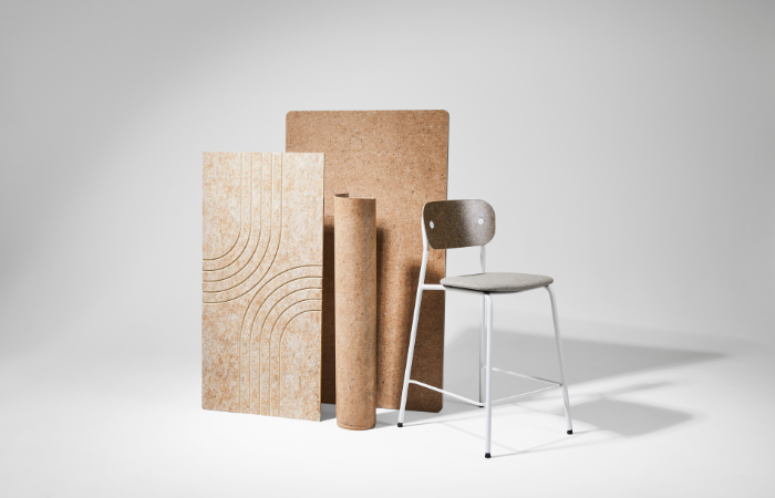 Produced by shredding and compressing waste fabrics, Rezign®, developed by Planq, reworks discarded textiles into a distinctive interior surface material. Common end-of-life wearables, such as denim and workwear, are mixed with a biobased binder to produce a versatile building material. The material retains the colour and character of its source, resulting in a textured, visibly recycled finish. Manufactured in Europe using local waste streams, it supports circular design by enabling companies to upcycle their own textiles into furniture and fit-out elements, combining low-impact production with a clear material narrative.
