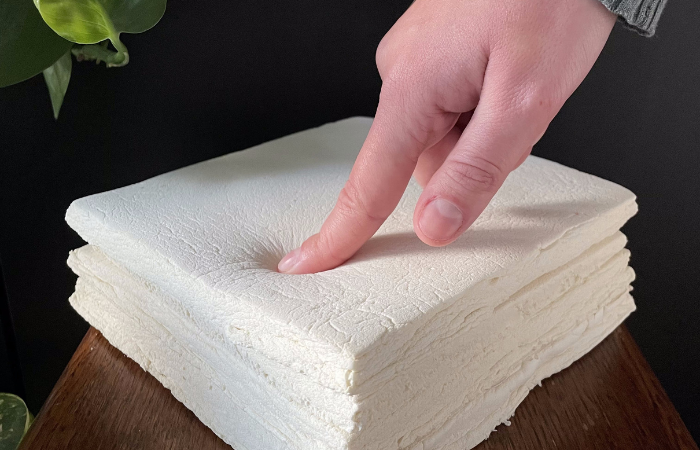 Combining structural stability with elasticity, it can be used for cushioning, packaging, or as a lightweight board material, while remaining easy to process. Crucially, the material is designed to be home-compostable, breaking down after use without leaving microplastics or toxic residues, positioning it within a new generation of circular, low-impact materials.