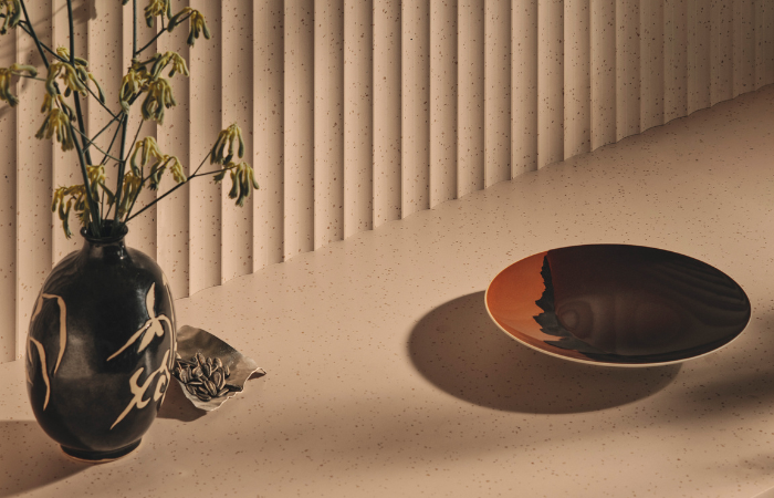Its Apple Pomace Films translate agricultural waste into translucent sheets that filter light, divide space and introduce a soft, organic material presence to interiors. Available in smooth, textured, opaque or semi-transparent finishes, the films can be printed, sewn, shaped or laser cut, making them suitable for blinds, partitions and lighting elements. Each batch reflects the character of the seasonal harvest, offering a renewable, non-toxic alternative to conventional synthetic textiles.
