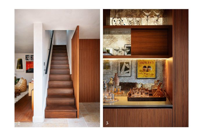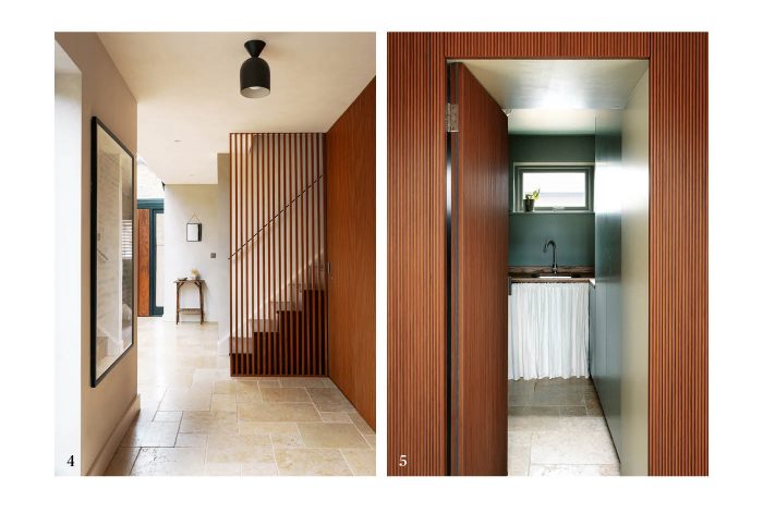 The panelling continues alongside the staircase, where a timber slat screen was introduced to maintain visual connection between spaces while allowing natural light to pass through. The result is a sense of continuity that draws the eye through the interior and enhances the overall flow of the ground floor.