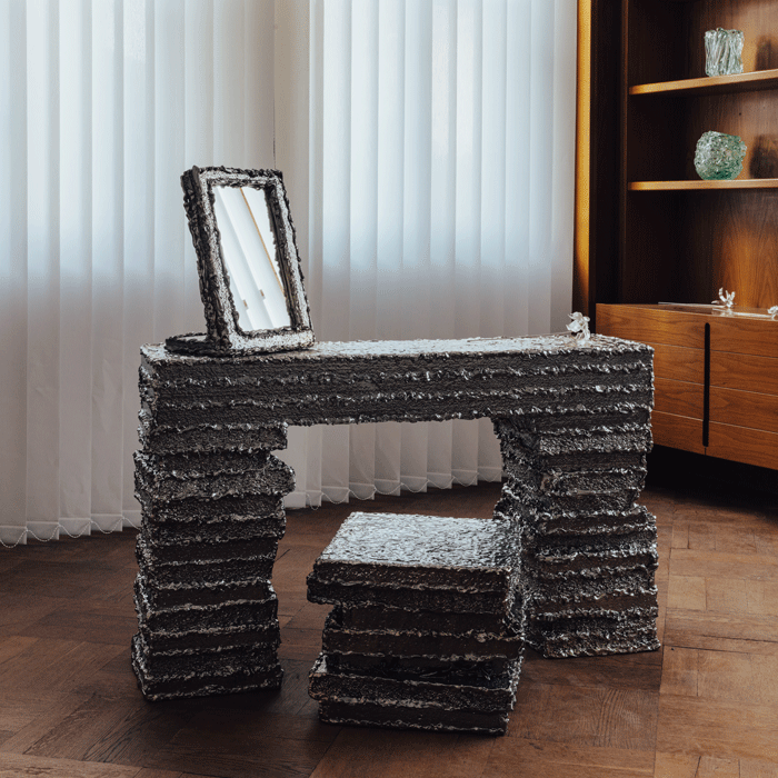 While known for their sculptural approach to jewellery, London-based Completedworks used the event to launch their new selection of interior objects and furniture. In stark contrast to the classical style of Villa Borsani, their bronze pieces, which included a desk and mirror, stood out for their deliberately unrefined aesthetic. Appropriately titled Layer Cake, the range evokes a multilayered sponge with squidged cream filling, juxtaposed by the use of dense metal with its semi-shiny finish.