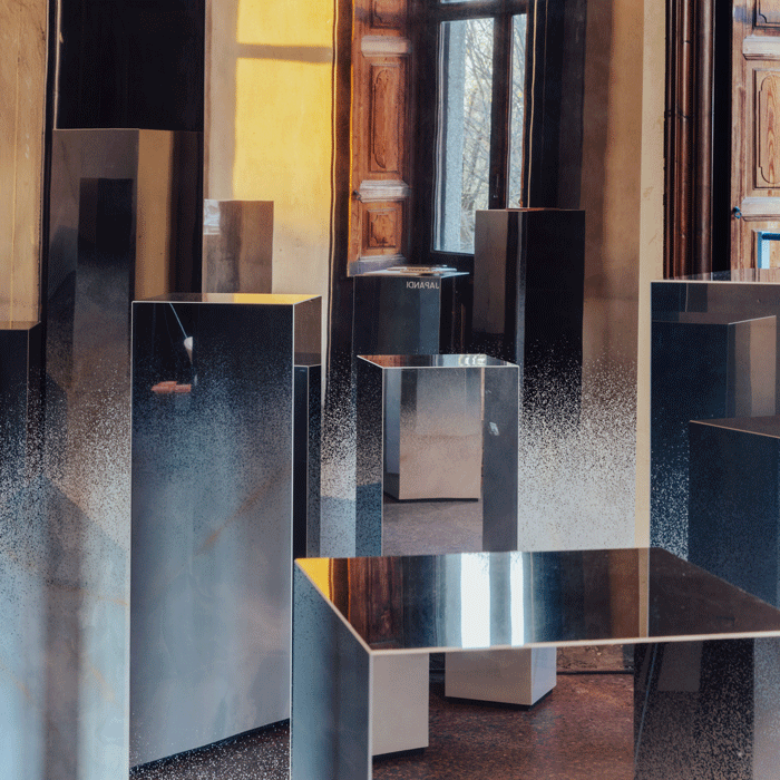 FAP Ceramiche also played off the architecture of the building with their Frozen Forest installation. The grouping of plinth-like forms beguiled visitors by both sitting within and reflecting back parts of the Villa Bagatti Valsecchi interior. Using an ombre effect across the surface of each panel, the partly mirrored monoliths were in fact made from porcelain stoneware, playing with volumes of space along with guests’ expectations of such a material.
