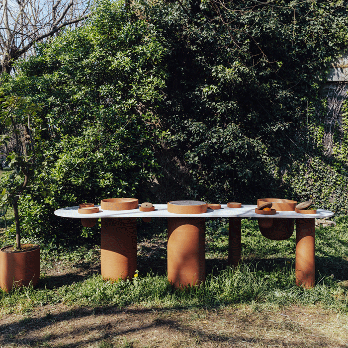Fellow Italian brand Terzofoco Ceramics also tradeoff the ancient knowledge of the material in creating LuneUp, a range of cylindrical ceramics that can be used indoors and out. Designed by Emanuel Gargano, each piece is hand turned in various formats and scales, and placed within a lightweight honeycomb aluminum work surface. The design offers flexibility, with the option to create a wash basin or barbeque along with structural support.