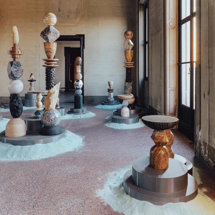 Meanwhile, Mexican brand Sten Studio’s installation Cosmic Resonance showcased the transformative possibilities of stone and marble, with an arrangement of totemic sculptures formed of distinctly shaped stacks of the material. A coming together of their Cosmic Traces and Cosmic Relics ranges at Milan Design Week, each totem expresses a mix of textures, forms and colourways, “Inspired by the enduring legacy of observing the cosmos.”