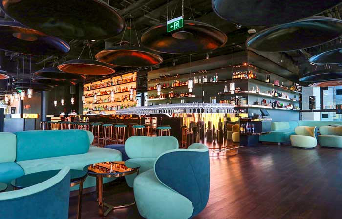 The Lighhaus bar serves up some of the best cocktails in the area, and has a green and copper colour theme running throughout. Decca provided all of the loose furniture, including banquette seating, lounge chairs, stools, and barstools and tables.