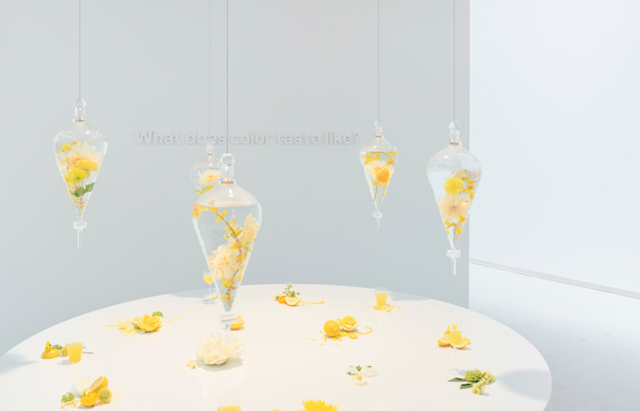 Moving through the interconnected installation visitors were met with highly stylised spaces, each a carefully curated set designed to create a deeper connection with colour. Guests were asked what colour might look, feel, smell and taste like, with visual prompts including a blue sky projected on the ceiling above, falling pink cherry blossom petals made from recycled paper and the citrus tang of traditional Italian Limoncello.