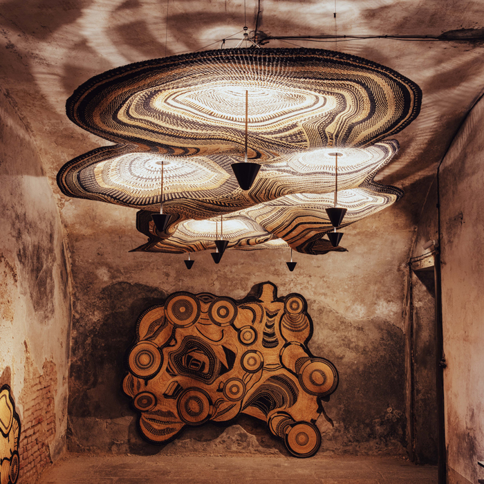 At first glance, the organic forms adorning the walls and ceiling of the Villa Bagatti Valsecchi designed by Alvaro Catalán de Ocón could easily have been mistaken for the homes of another striped insect; the wasp. In fact, the woven wall hangings and lighting are the industrious output of The Baba Tree Basket Company from Ghana and the technical industrial design of the PET Lamp project. Calling upon the former’s rich cultural weaving tradition, the collaborative pieces serve to save waste from landfill, in this case, PET plastic.