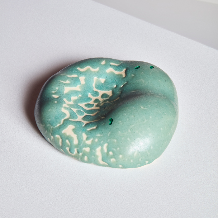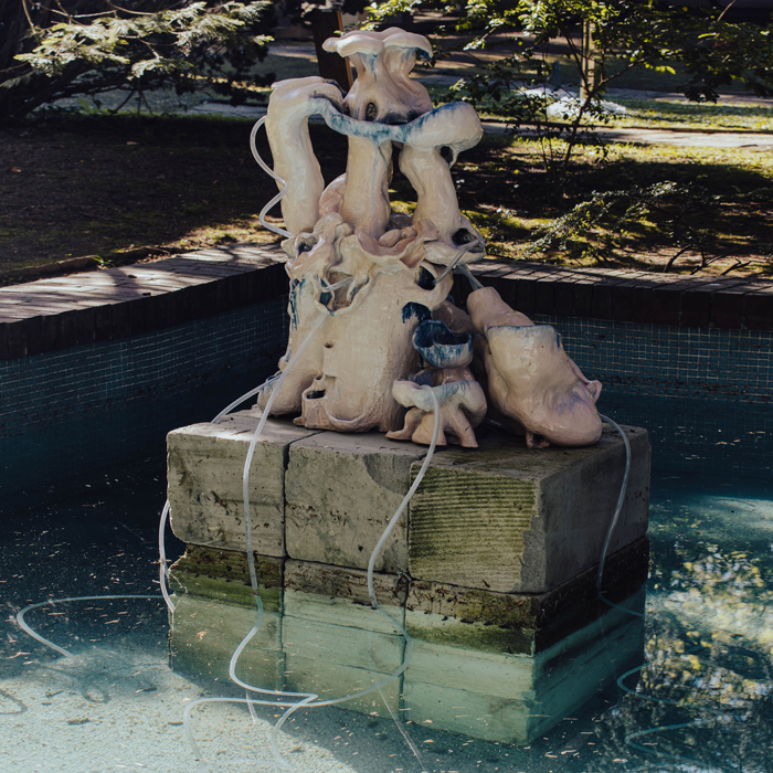 Another unusual sculptural form could be spotted in the grounds of Villa Borsani, the second home of the Alcova exhibition. Sonic Currents by Brogen Berwick and Lana Bolkvadze uses the flow of water to physically highlight ever-increasing noise pollution. The organic ceramic piece is fed by a series of plastic tubes that create a flow of water. The fountain is designed to respond and react to data collected from underwater noise, which in turn informs the volume and flow of the water, thus creating a visceral response in the viewer.