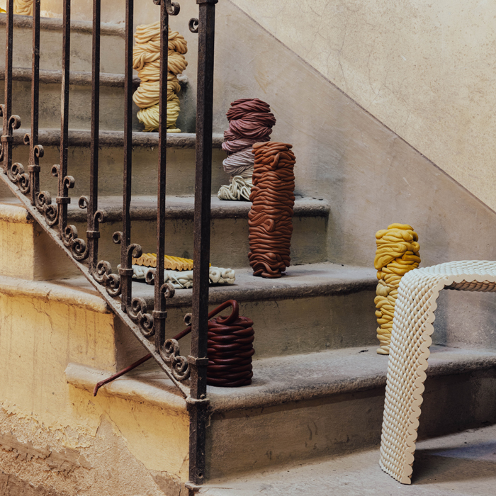 To make a collective impact in turning the tide on the environmental disasters that are unfolding across the planet will take systemic change; a baton that is being almost forced into the hands of younger generations. That is something being recognised by the staff and students at ECAL/University of Art and Design Lausanne, whose showing UPS – Under Pressure Solutions was a testament to. Inspired by Gaetano Pesce’s UP5 Chair, a piece designed in 1969 and made from polyurethane foam that expands when it’s unpacked, the team set out to experiment with more sustainable materials that share the same expansive and compressible qualities.