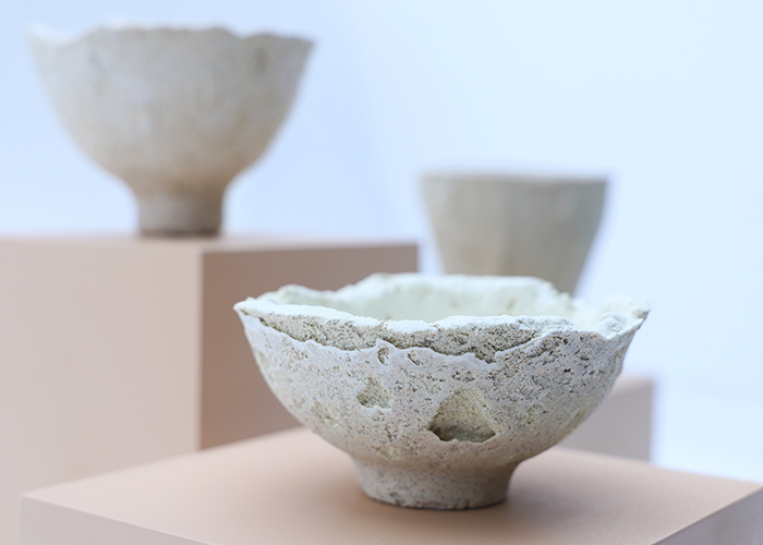 Nicole Chrysikou takes a slightly different approach to transforming superfluous materials in creating her work titled BacTerra. Whilst she uses waste, in this case ceramic, she also involves another novel element to her process with the introduction of soil-born, non-pathogenic bacteria. Recognising that the traditional method of producing ceramics involves energy-heavy kiln firing, Chrysikou applied biotechnological thinking, and discovered that incorporating the bacteria into her glaze created a biomineralisation process that naturally solidifies. The resulting “bioceramics” therefore require no heat energy whilst at the same time, save industrial waste from going into landfill. The same can be said of the equally unique work shown during the Robot Shit exhibition, although as the name suggests, this work makes use of a very different and much newer waste stream; excess 3-D printing scraps. Created collaboratively by DesignWanted, _sucks and Caracol the project draws attention to an until now overlooked, and yet still valuable material resource.