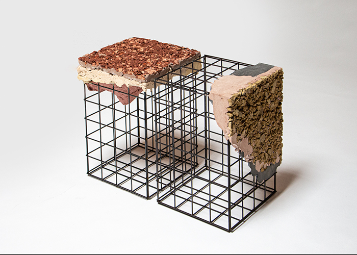 Chilean designer Macarena Torres Puga has also turned her attention to the upcycling of waste created by the construction industry, although more specifically, she utilises materials produced when buildings are deconstructed to make way for the new. Her circular approach involves the reprocessing of two of the most abundant materials extracted from the rubble of building sites; bricks and concrete. In doing so, she creates sleek moulded forms that serve as interior design products, on which the sedimentary layers show each products unique material history.