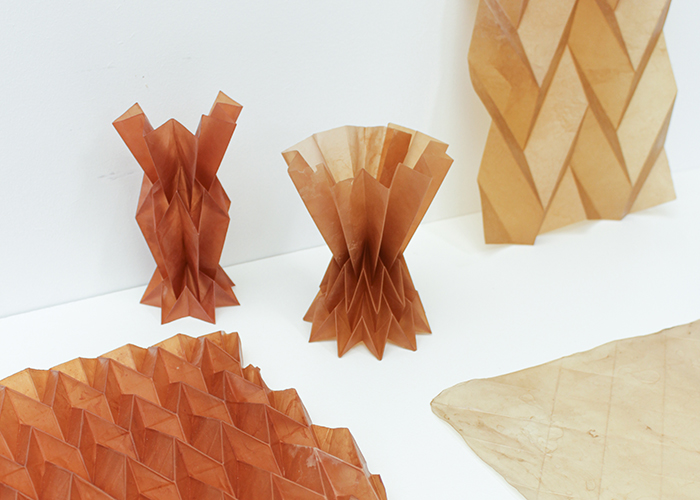 Lionne Van Deursen is concerned with sustainble materials and production processes and deploys microorganisms to grow new surfaces. At the show she exhibited Unfold, a new project that utilises a symbiotic culture of bacteria and yeast to produce a biofilm that becomes rigid when dried. The plastic alternative is not only grown but dyed with natural pigments, and as well as being strong and sturdy, it is also fully formable and biodegradable.