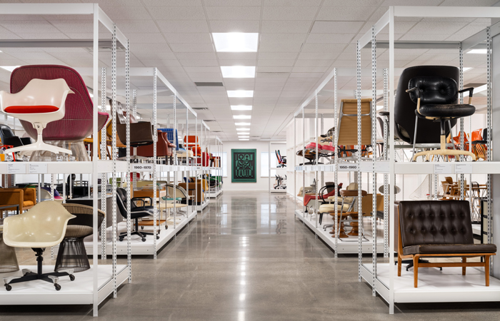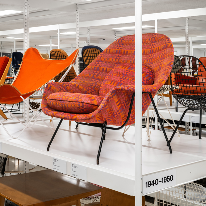 Over 300 pieces of modern furniture design are on display, with both well-known original works from Knoll and Herman Miller and contemporary designs from other MillerKnoll brands like HAY, Geiger, and NaughtOne. The open storage racks trace the evolution of modern furniture from the 1920s to today. Standout pieces include a rare prototype of the Knoll Womb® Chair, gifted by Eero Saarinen to his mother, Loja Saarinen; groundbreaking Gilbert Rohde designs for Herman Miller, first showcased at the 1933 World’s Fair; early office furniture designs by Florence Knoll; and a lamp and rocking stool created by Isamu Noguchi for Knoll, among others.