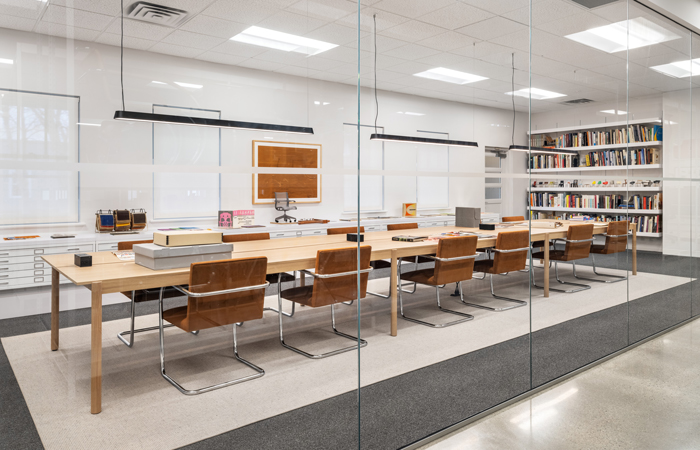 Adjacent to the open storage, the reading room features an array of exceptional archival materials including correspondence, photography, drawings, and textiles. With over 250 linear feet of archival documents, significant materials include memoranda detailing the development of George Nelson’s first collection for Herman Miller; design and engineering drawings for classic products including the Eames® Lounge Chair and Ottoman for Herman Miller; and original “paste-ups” created by Florence Knoll featuring layouts for her well-known interiors.