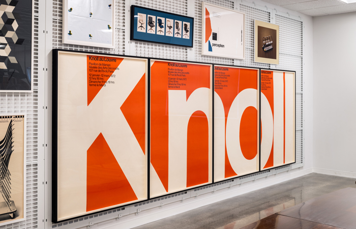 Grid wall featuring framed archival graphic design and advertisements from Herman Miller and Knoll. Large Knoll posters from the exhibition, Knoll au Louvre, 1972.