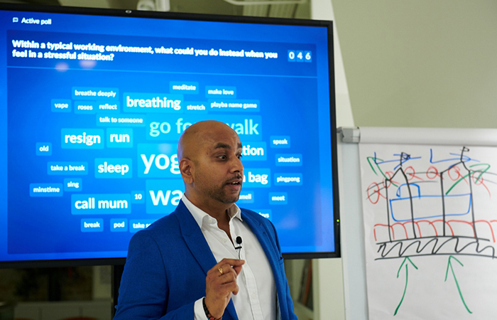 Stress guru Neil Shah explained that our typical response of turning to stimulants (such as caffeine, refined sugar, nicotine and alcohol) at times of pressure exasperates the problem. As an alternative he shared breathing techniques and ways to help individuals define and articulate their stress levels.
