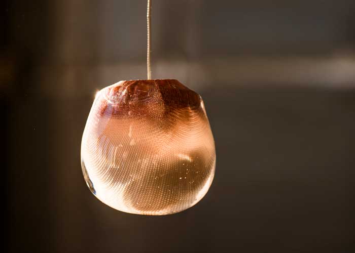 Founded in 2005, Canadian design company Bocci has a growing portfolio of contemporary design specialising in sculptural lighting. For the 84 Series, a white glass moil is captured inside a fine copper mesh basket and then plunged into hot clear glass. Air is blown into the matrix to gently push the white glass through the mesh, creating a delicate pillowed form that is suspended inside the thick outer layer of clear glass. Sometimes the copper mesh basket folds and crinkles, adding specificity to each piece. Undulations in the exterior shape are a natural consequence of the fabrication process and accentuate the gentle white pillowing below. A low-voltage xenon or LED light source is introduced into the piece, casting a warm coppery hue.