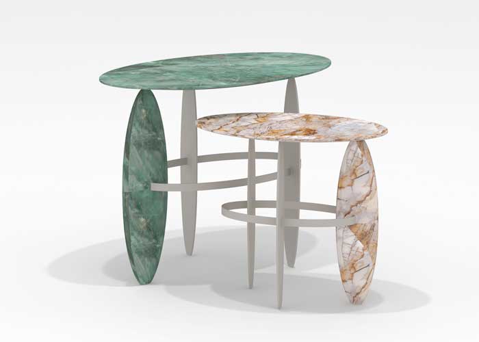 A myriad of cultural references associated with contemporary creations are the foundations of this luxury furniture and goods producer. The creations of AuCap bring together the Brazilian cultural syncretism with global and contemporary background and experiences that are materially translated into unique concepts, shapes and materials. The Pablo Tables celebrate the species of the Brazilian rainforest. The diversity of the Brazilian forest and thus of the wood species – is widely known. But there is a further type of diversity hidden underground: stones. Chosen from more than 100 types found in Brazil, the Pablo tables are made of Emerald Quartzite and Spider Quartzite; such quartzites are only found in specific sites and small quarries of Brazil, which makes them be considered semi-precious stones, still being mystically considered for their energetic properties. The intersection of the oval planes, vertical and horizontal, evoke the shadows of the rich forest.