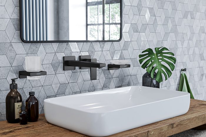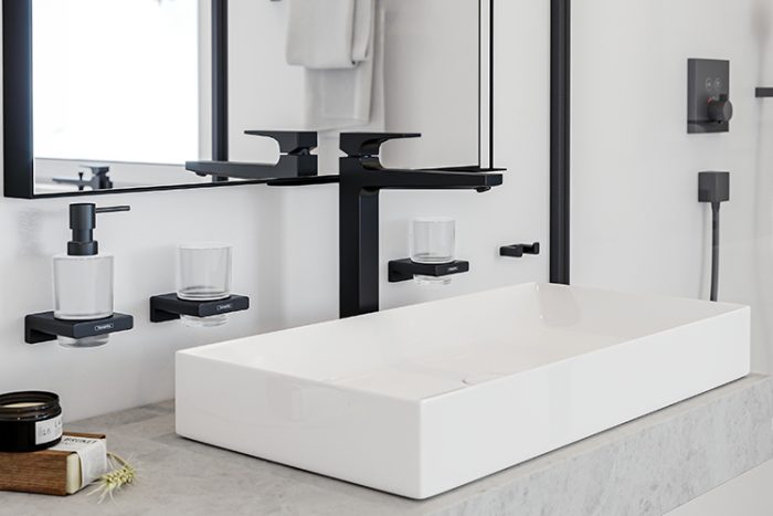 The accessories are designed to blend harmoniously with any bathroom space. Minimalist mixers, such as the hansgrohe Metro pol in a stylish matt-black finish, are mirrored by pared-back accessories from the new range.
