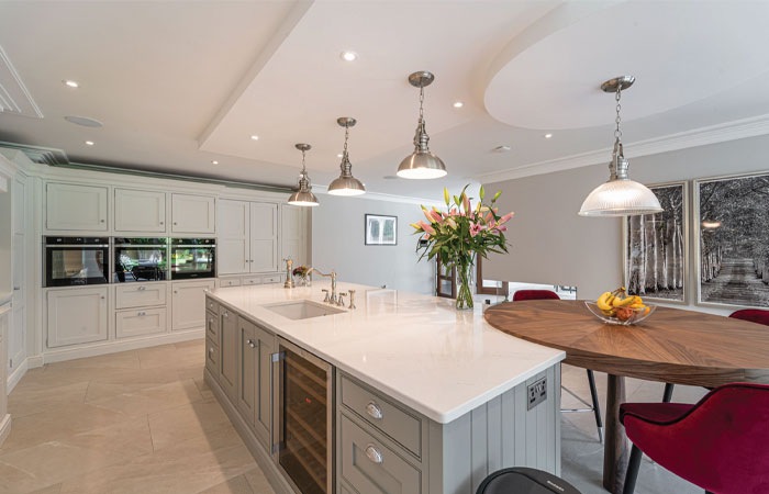 Centred over the kitchen table is the Charter pendant in a satin nickel finish with a heavy clear ribbed glass. Let’s not forget the lighting feature over the kitchen island in the form of the 3 Vista pendants manufactured from industrial style metal in a satin nickel finish with a frosted glass base to diffuse the light.