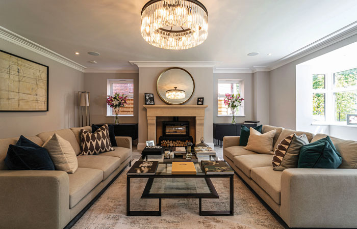 Other key aspects within these homes include a cinema/games room, dressing rooms, study, utility and cloakrooms offering plenty of spaces designed for exquisite lighting. Suspended from the vaulted hallway and the ceiling at the top of the staircase are the Taper pendants showcasing smoked angle cut glass on impressive 22 light matt black fittings.