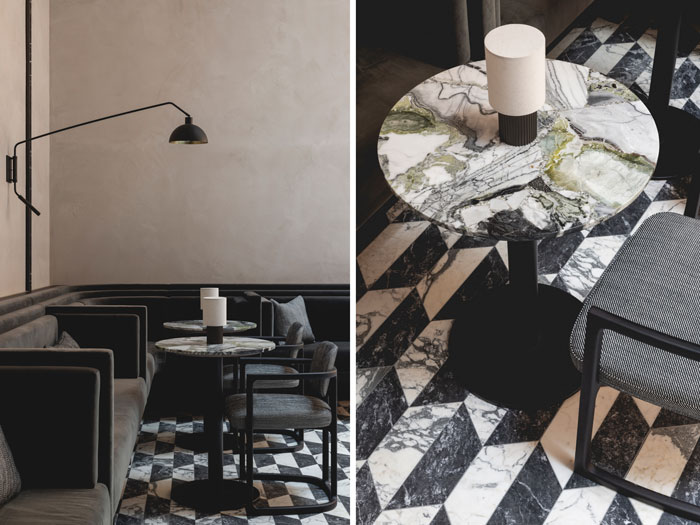 To balance the use of hard materials such as marble and concrete, acoustic considerations were integrated using fabric ceiling rafts and textured acoustic plaster. Soft furnishings designed by MoreySmith’s in-house team include dark grey velvet banquettes and a commanding ottoman sofa in a moss green velvet further contribute to a balanced, welcoming environment. Discreetly concealed heating and cooling grilles within shadow gaps at the bottom and top of wall panelling in the reception space emphasise the meticulous attention to detail.