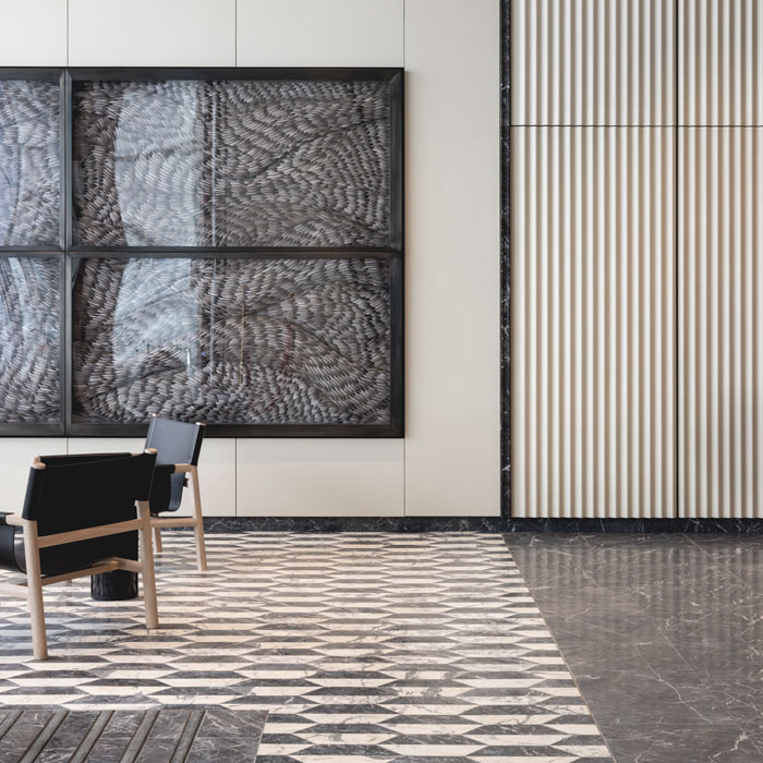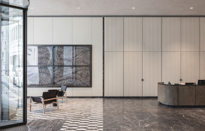 Inside, the reception area exudes a classic modern style, offering an inviting, light-filled space. High quality materials, muted colours, and a sleek mid-century aesthetic create a sophisticated atmosphere. The interior features a bespoke geometric tiled floor with honed Grigio Carnico and Arabescato marble, corrugated concrete, and battened timber wall panelling, showcasing exceptional craftsmanship.