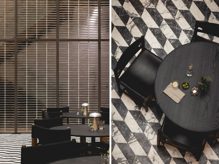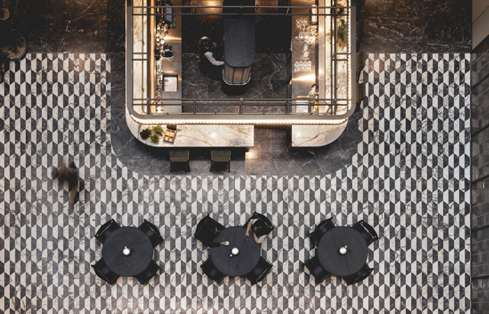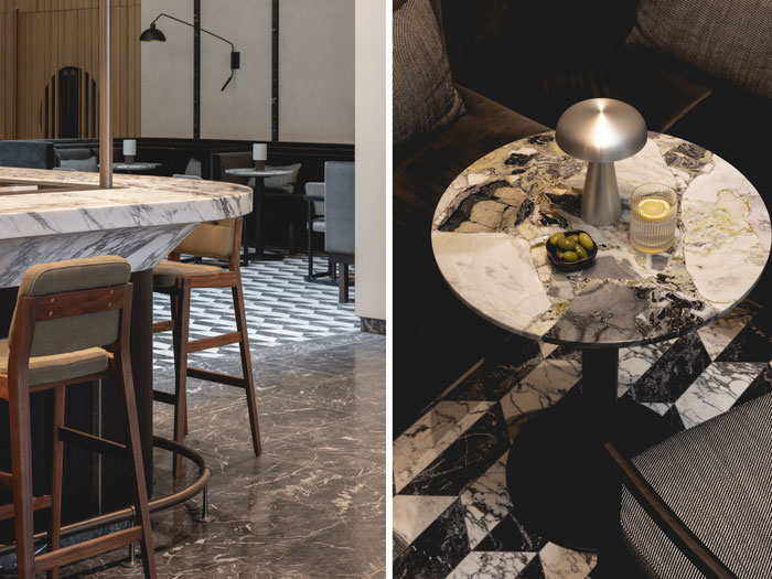 The bar forms an elegant focal point and source for refreshments for guests to perch on the high stools or retreat to the velvet banquets for informal meetings. MoreySmith ensures no detail is overlooked, and is designing the staff uniforms for the mainly monochrome space.