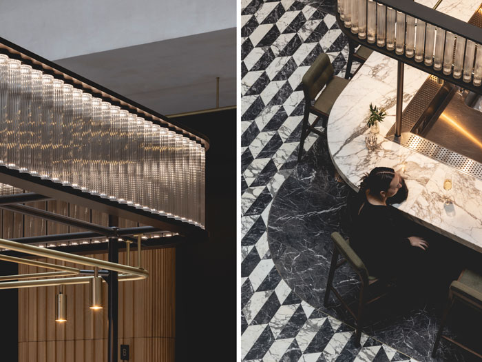 A highlight of the reception is the ‘Hera’ bar, crafted from profiled smoked oak panelling and a double-curved Arabescato marble bar top. A customized Coppibartali luminaire by Viabizzuno, encapsulated within a bespoke framework, creates a halo of light above the bar, enhancing its presence. Adjacent to the ‘Hera’ bar stands a five-metre-high glass brick wall, providing an elegant, obscured divide from the existing staircase.